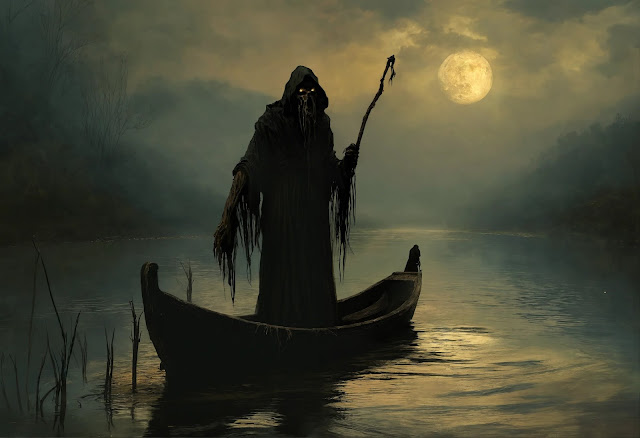 Caronte es el sombrío barquero del río Estigia, el río que separa el mundo de los vivos del inframundo. Su tarea es transportar las almas de los muertos a través de las aguas oscuras hacia el reino de Hades, pero sólo lo hace si se le paga con una moneda, tradicionalmente colocada en la boca del difunto antes del entierro. Aquellos que no pueden pagar están condenados a vagar por la orilla durante cien años.